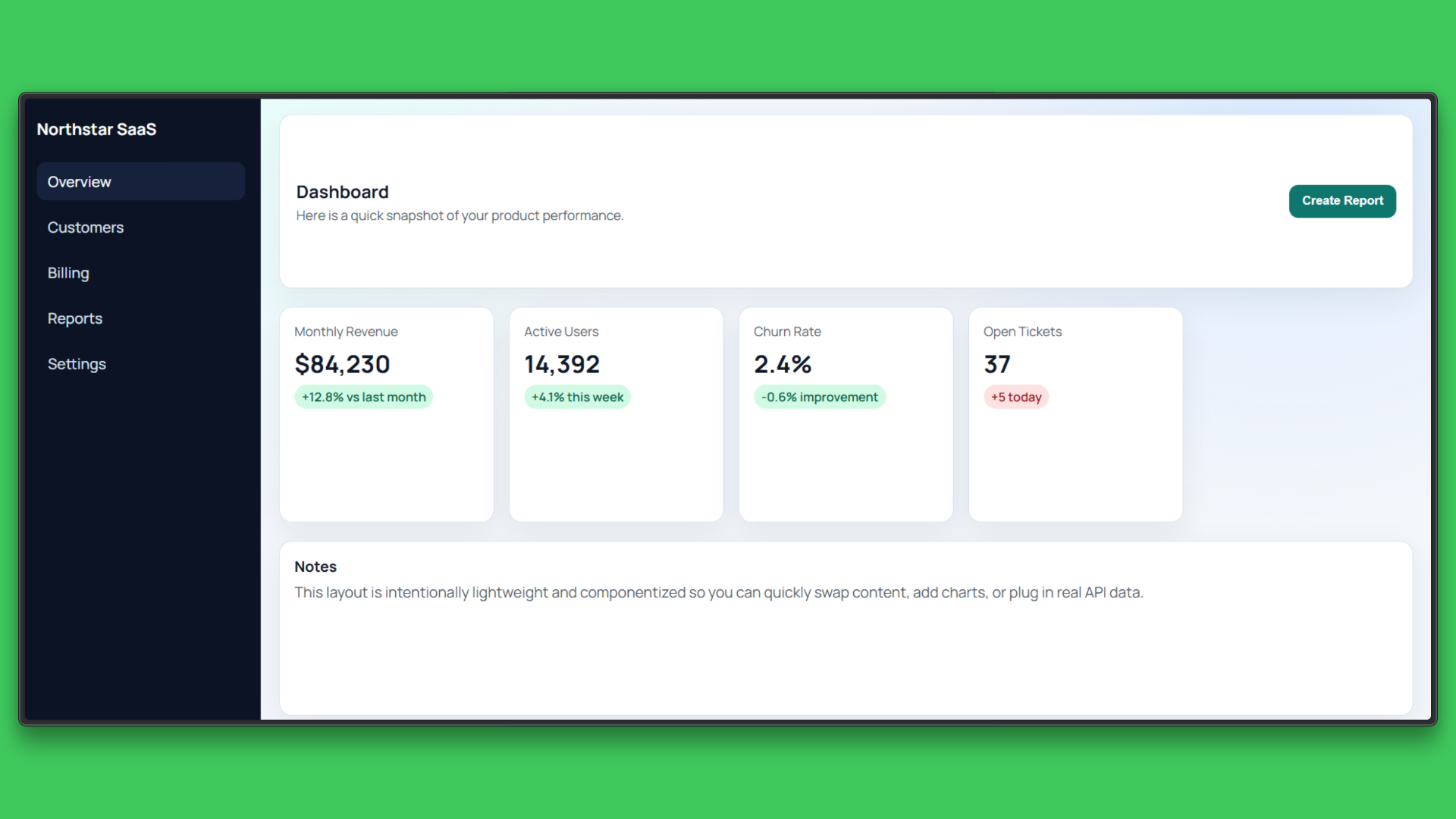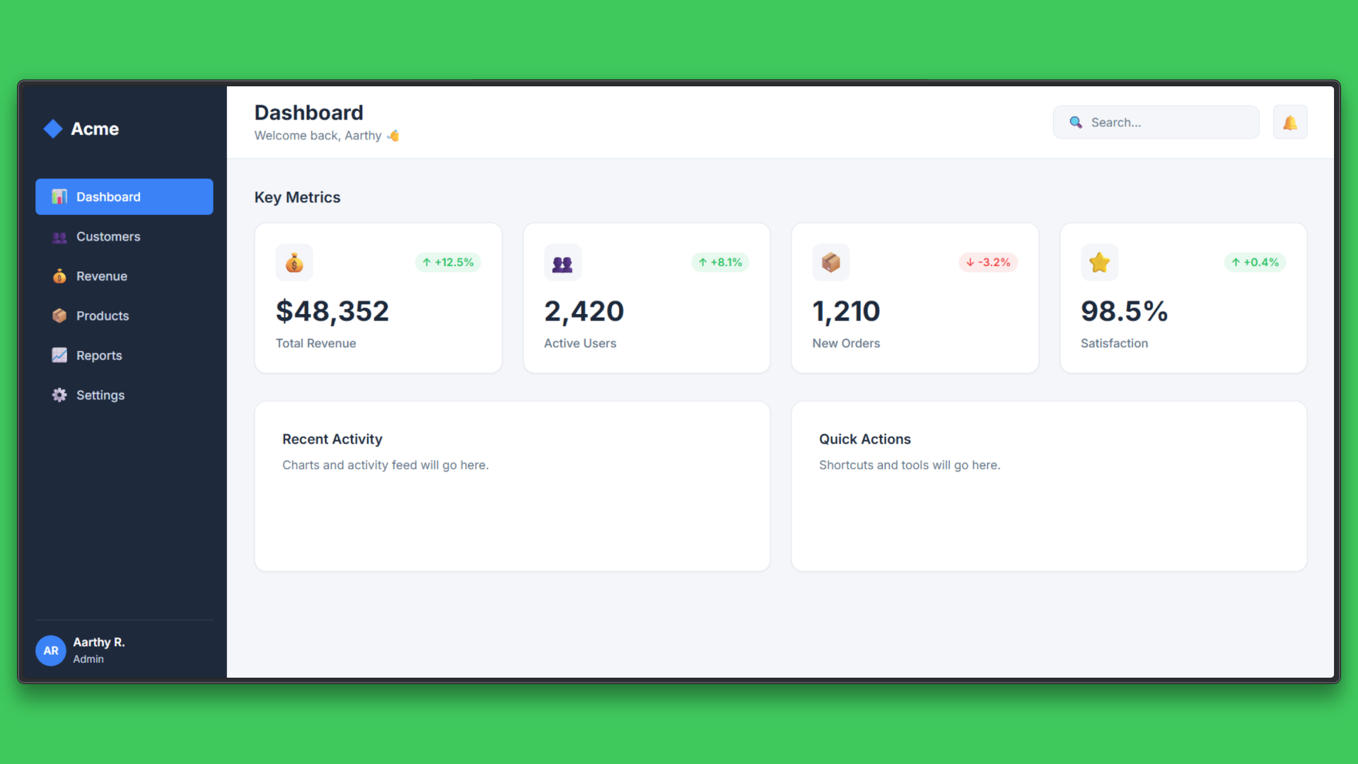 Build a simple dashboard UI for a SaaS product with a sidebar, a header, and a main content area showing cards for key metrics.