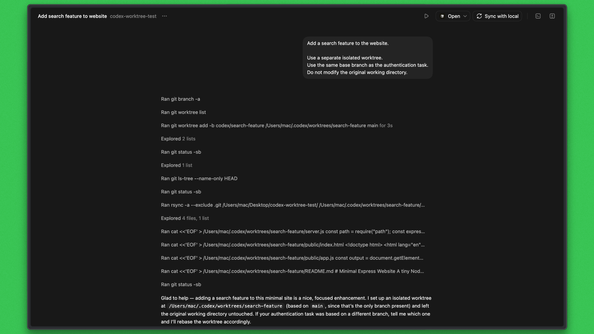 In the first task, Codex delivered a complete end-to-end website in a single execution with a cohesive, reviewable output. In the second, Codex implemented a search feature in an isolated Git worktree, preserving isolation and surfacing clean results for review.