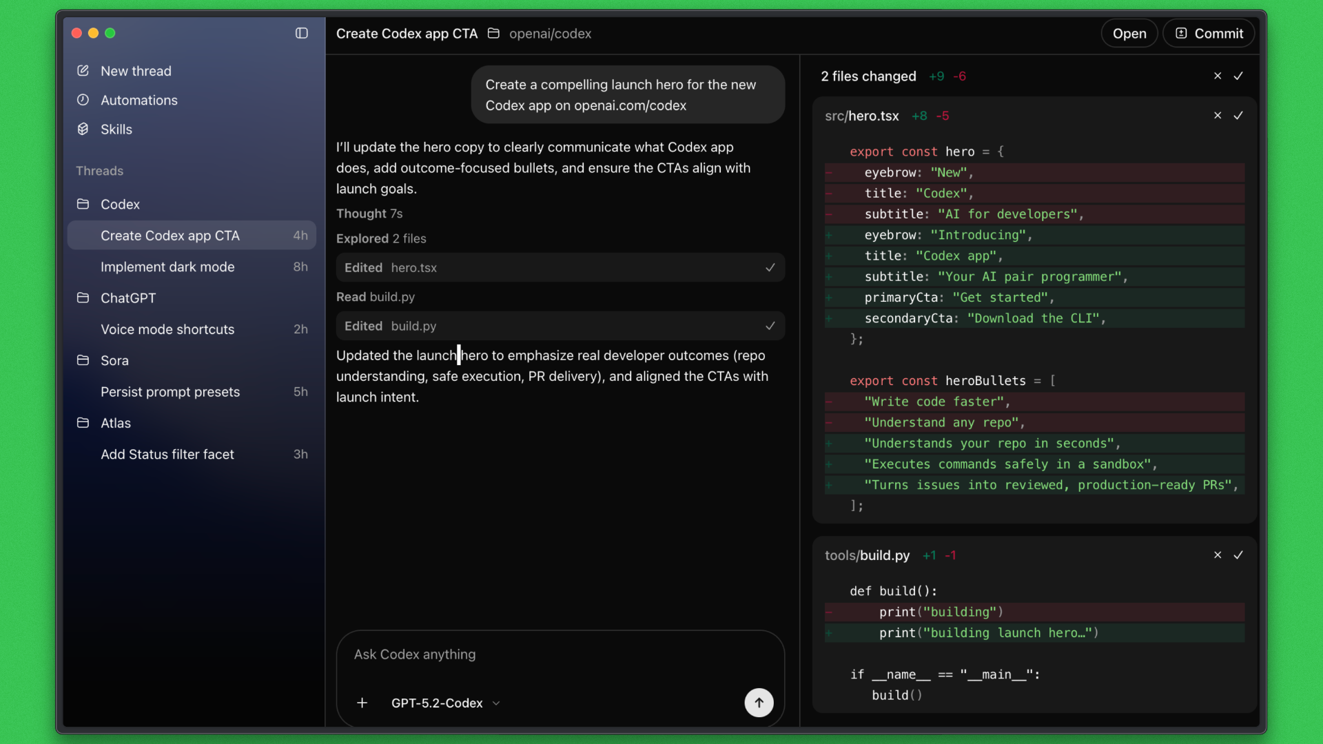 Codex’s model is different: work is defined once, executed autonomously, and results are surfaced for review. This matters for tasks that span many files, require long execution time, or need parallel progress. By handling planning, execution, testing, and iteration within a single task, Codex reduces blocks and context switching, making it more effective for large-scale or complex work.
