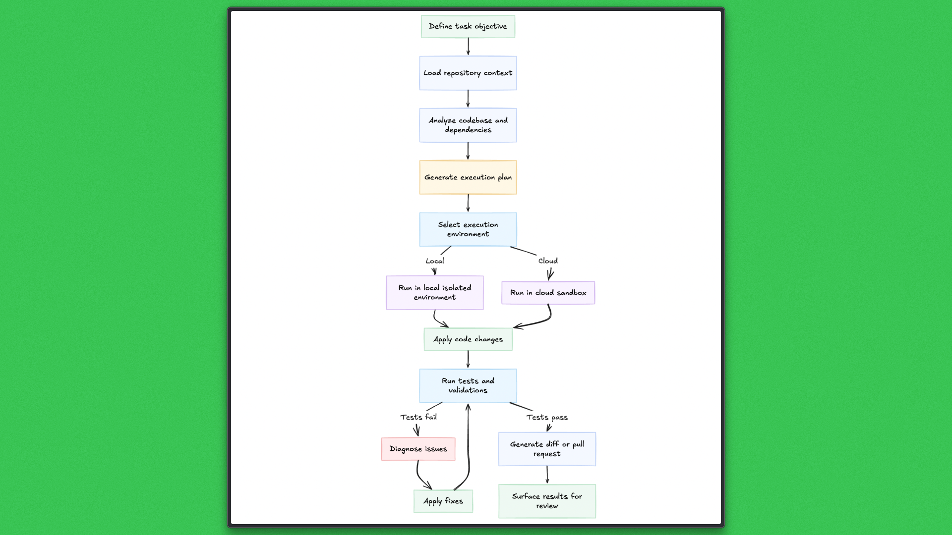 - Diff and pull request outputs: Results are presented as structured diffs or pull requests, aligning autonomous execution with standard version control and review workflows.