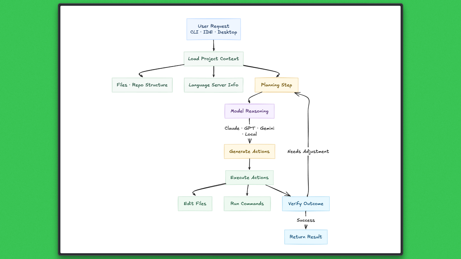 Context handling is another central part of the design. OpenCode loads project structure, language server information, and recent changes so the agent can work across multiple files without losing track of earlier steps. This matters most during longer sessions where tasks span many iterations.