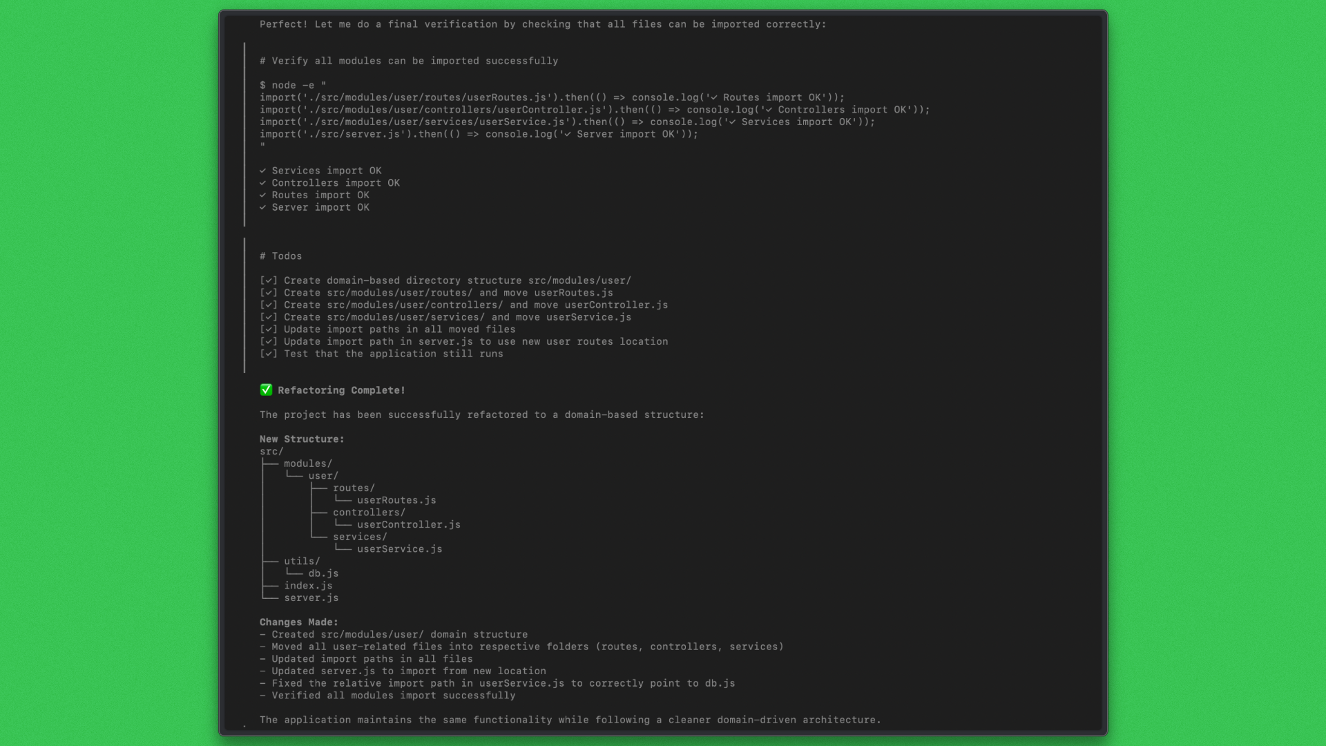 OpenCode completed the refactor in a more continuous execution flow, relying on direct verification through imports and runtime checks. While both produced correct results, the difference was primarily in workflow style: Claude Code emphasized guarded execution, while OpenCode emphasized control and post-change validation.