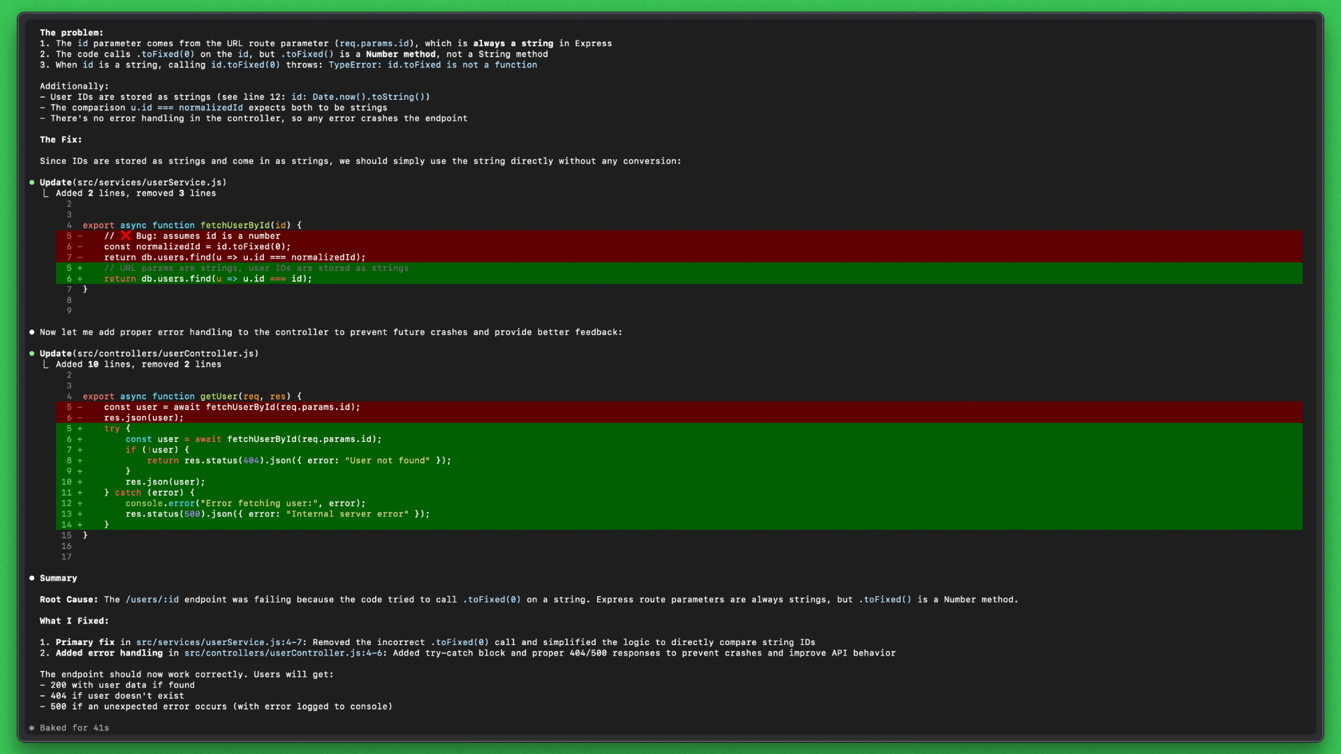 Both Claude Code and OpenCode correctly identified the root cause of the production failure by tracing the error from logs to a type mismatch in the service layer. Each tool fixed the issue by removing the invalid numeric conversion and restoring correct string-based ID handling.