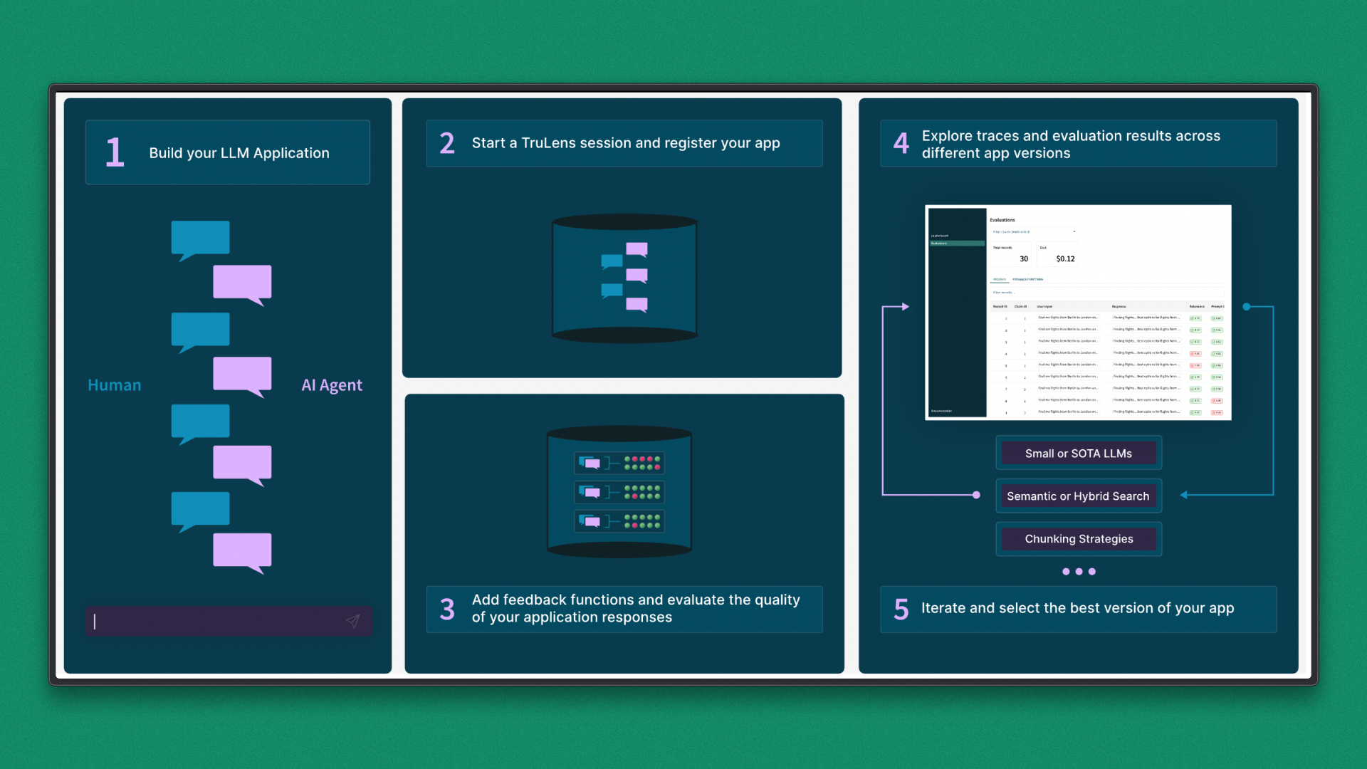 TruLens is an evaluation framework designed to assess LLM and agent outputs against defined quality metrics. It enables teams to score responses based on relevance, correctness, groundedness, or custom rules.