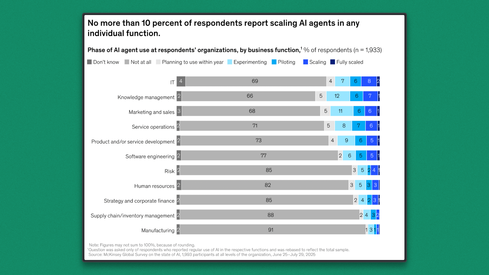 Most deployments remain focused, with no more than 10% reporting scaled usage within any single function, indicating that agents are being applied where they deliver clear and immediate value.
